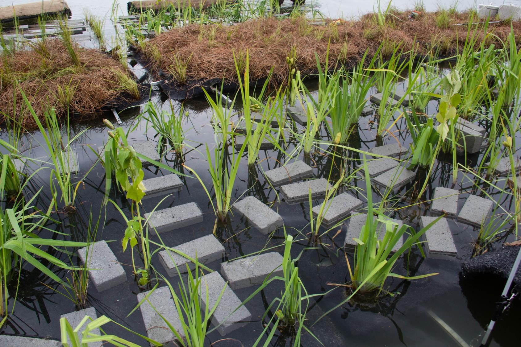13-Brick weights September 19, 2017 1688 × 1125 13-Brick weights Close-up of a floating wetland unit. Brick weights help keep the plants evenly balanced, with roots below water, photo by State Parks.