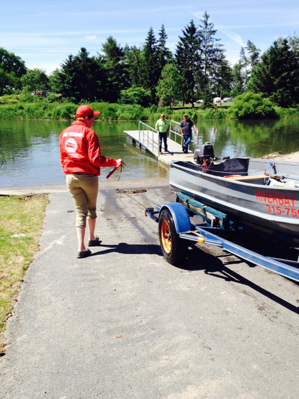 karissa May 6, 2015 593 × 790 Battling Invasive Species at the Boat Launch A Parks Boat Steward conducting a watercraft inspection at Keewaydin State Park. Photo by Megan Phillips, OPRHP.