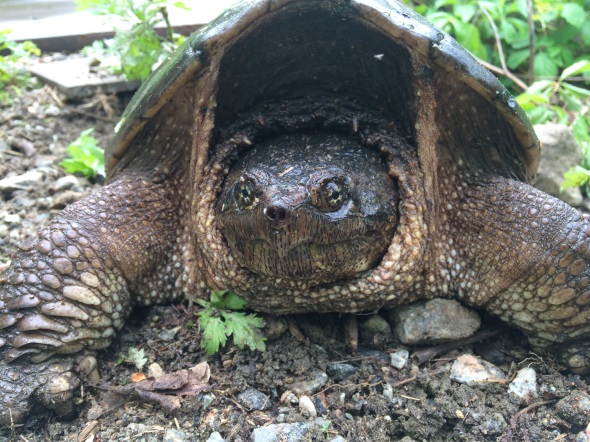 While conducting field work in Clarence Fahnestock State Park the Environment Management Bureau’s Wildlife Unit came across this large female snapping turtle in early June. This female snapping turtle was observed digging a hole in the sandy soil to lay her eggs. This time of the year a variety of wildlife are giving birth or nesting to produce this year’s offspring. Turtles, as you may know, do not move very fast on land and tend to get hit by vehicles while attempting to cross the road. Please watch out for them on the roadways! Snapping turtles and turtles in general look for sandy soils that are easy to dig in to create their nest and lay their eggs. Nesting can take place quite a far distance from water. This is okay! Once hatched, the baby turtles will find their way back to a water source nearby. Get out in nature, experience our beautiful wilderness and all it holds, but please remember to not disturb these natural processes and give wildlife some space to be wild.