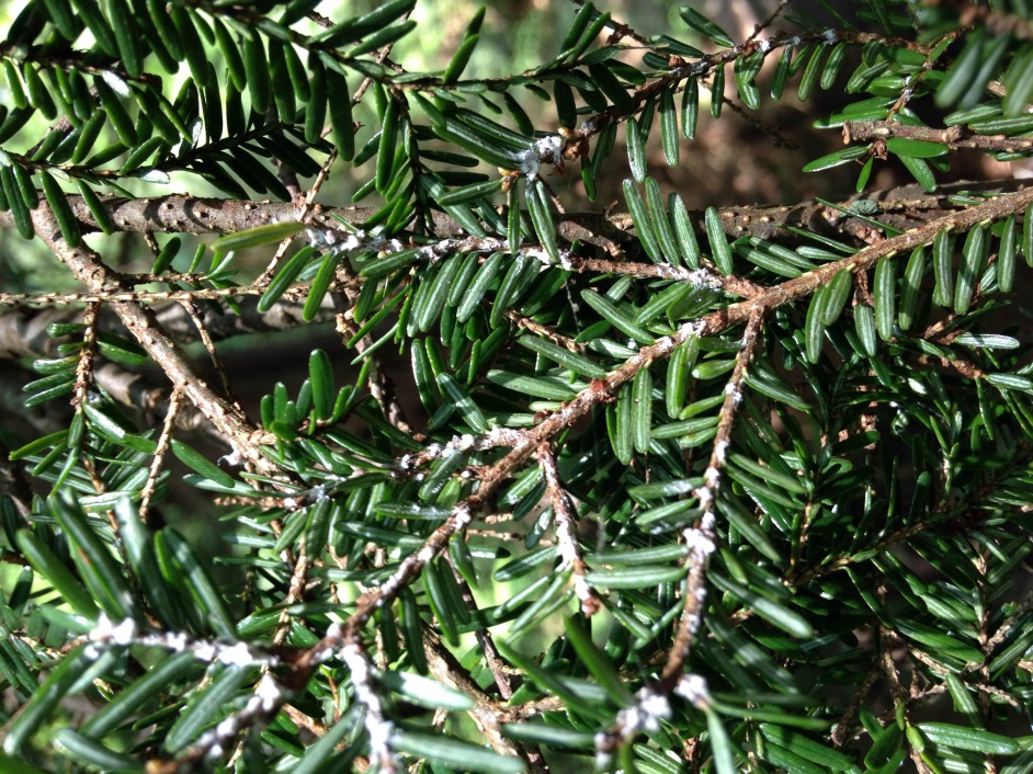 1 September 10, 2015 942 × 706 Forest Health Specialists: Climbing in Pursuit of Invasive Insects Hemlock Woolly Adelgid on hemlock stems. Look for small, white, cotton-like blobs on the underside of hemlock branches, right at the base of the needles.