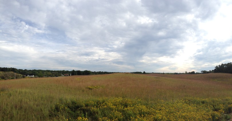 South facing panoramic view of one halve of the grassland management area. Warm season grasses dominate and give off the blue/red hue, while goldenrod provides a yellow color in the lower height range. Line of goldenrod helps to indicate one of the areas not originally seeded for the project, this area is overrun with beautiful purple lupine blooms in the spring and early summer! Photo by Whitney Carleton.