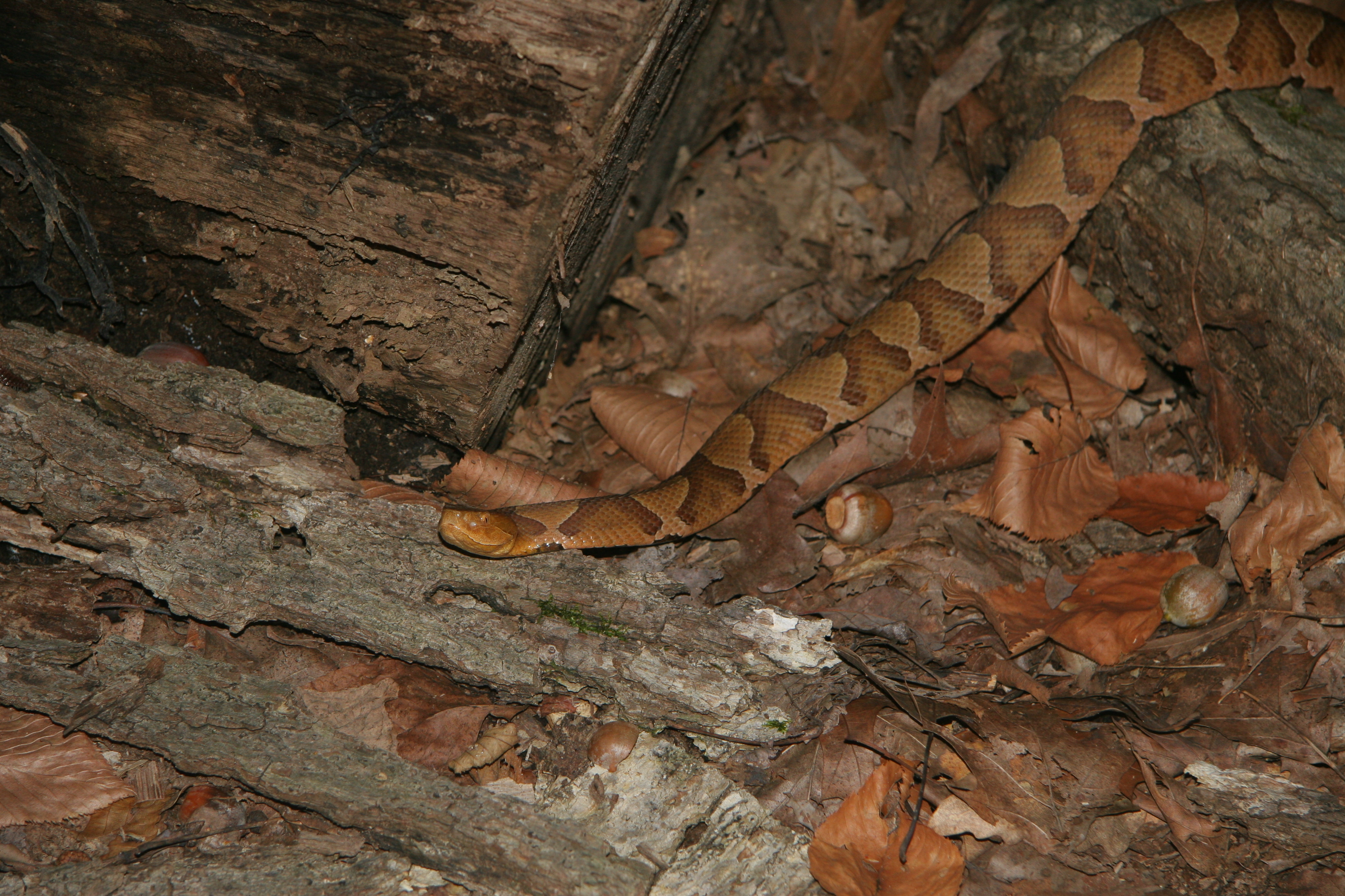 Copperhead Schunnemunk – Lilly Schelling November 12, 2015 3504 × 2336 Sampling Wildlife Populations in State Parks: White-tailed Deer The copper head was slightly more difficult to see, as it blends in very well with the fallen leaves and was staying perfectly still. Only its eye shine in the headlights gave it away.