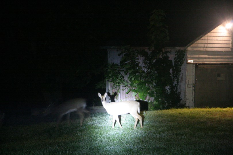 The deer will usually stop when the light is shining on them, but not for long! So surveyors must be quick at getting a group count, an angle, a distance, and determining the age and sex of the deer. Often other animals are observed as well. On this particular survey evening we saw two red foxes, a skunk, a raccoon, a rattlesnake and a copperhead snake.