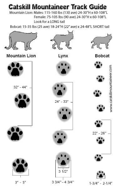 TrackGuide_CatskillMountaineer February 21, 2019 377 × 600 Felines in the Northeast Image 4: Image above compares mountain lion, lynx, and bobcat pawprints. image courtesy of Catskill Mountaineer