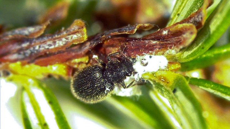 But biocontrol against the invading adelgid may be on the way. It is the form of a small dark beetle and a small silvery fly, nicknamed “Little Lari” (Laricobius nigrinus) and “Little Leuc” (Leucopis spp.), respectively, by researchers at the New York State Hemlock Initiative at Cornell University.