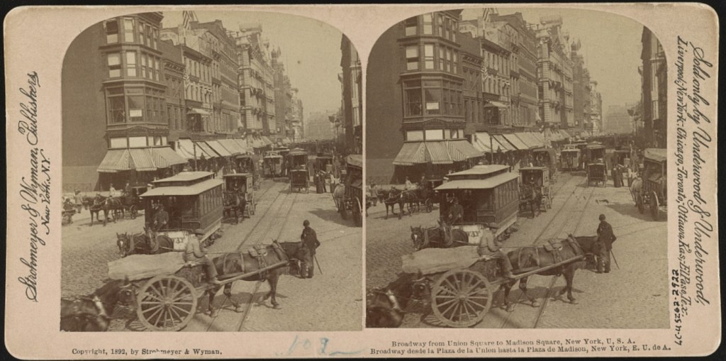 New York City needed thousands of horses to pull streetcars and wagons, in these street scenes on Broadway and Center Street. (Photo credit- Library of Congress)