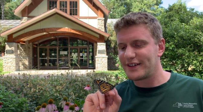 Cover shot – Letchworth State Park Environmental Educator Elijah Kruger with a Monarch butterfly. (Photo credit – NYS Parks)