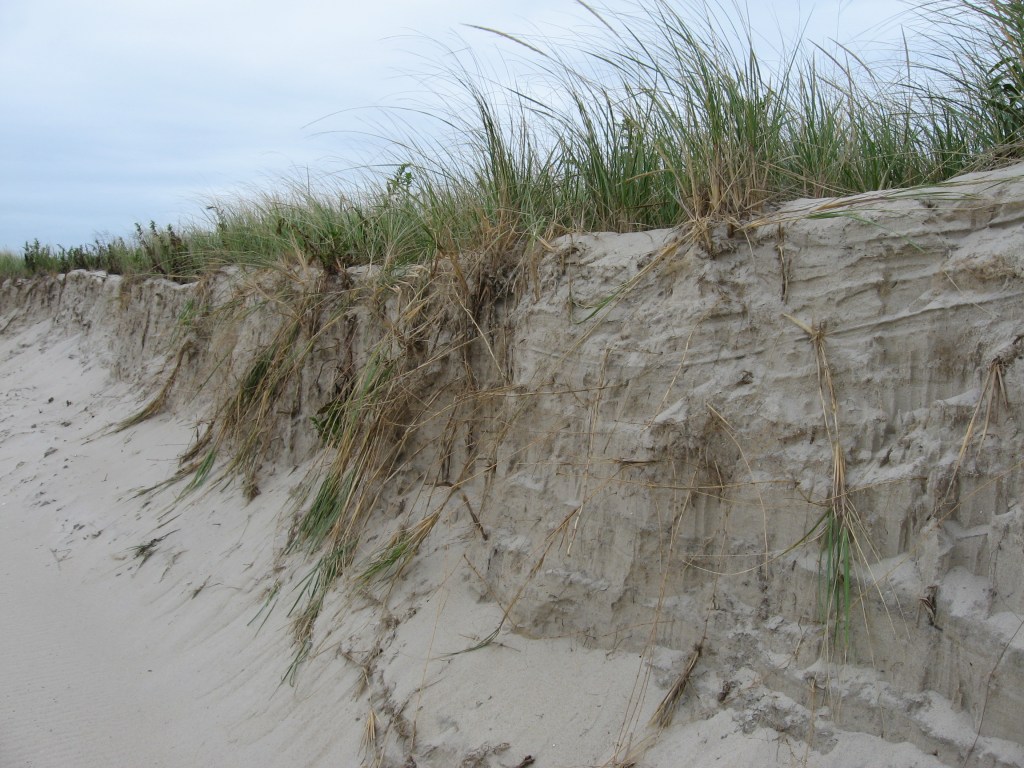Winter and storm-season waves typically contain more energy, pulling more sediment off the beach and into the water in a process called erosion. When large waves wash over dunes during high tides and storms — a phenomenon called “overtopping” — dunes can flatten and shift. In summer, ocean currents, waves, and winds typically bring sands back onto the beach and dunes in a everchanging cycle.
