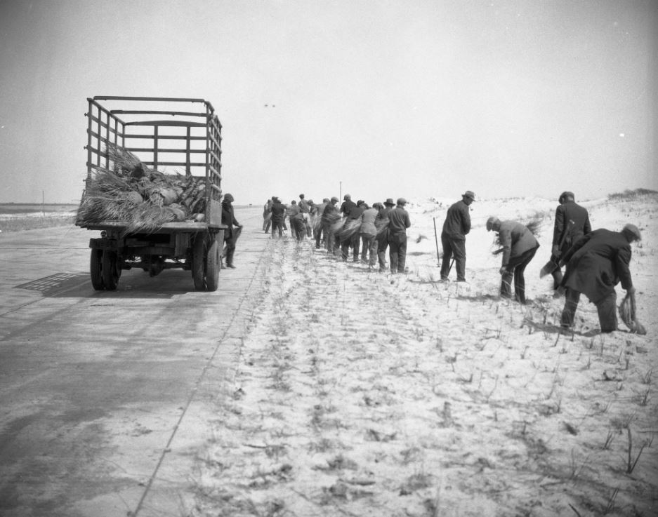 Jones Beach opened in 1929 as a triumph of 20th century engineering. Forty million cubic yards of sand were dredged from the bay to widen the beach and raise its elevation up to 12 feet. Workers hand-planted a million native Beach Grass plants to prevent the taller dunes from blowing away in the wind.