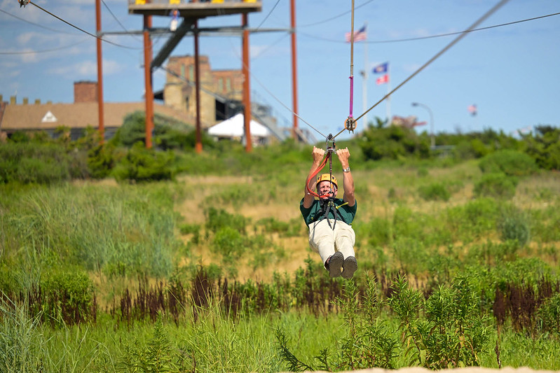 During the launch tour, a small group of staff and I made ten stops – at Olana State Historic Site, Walkway Over the Hudson State Historic Park, Harriman State Park, Jones Beach State Park, Old Fort Niagara State Historic Site, Niagara Falls State Park, Ganondagan State Historic Site, Green Lakes State Park and Saratoga Spa State Park – where I enjoyed biking, ziplining, firing a cannon, swimming with lifeguards, kayaking, lighting Niagara Falls for its evening illumination, and more! I was also pleased to have special guests join us all along the way at tour-stop events, and to have the chance to connect with many of our amazing staff members and supporters as well.