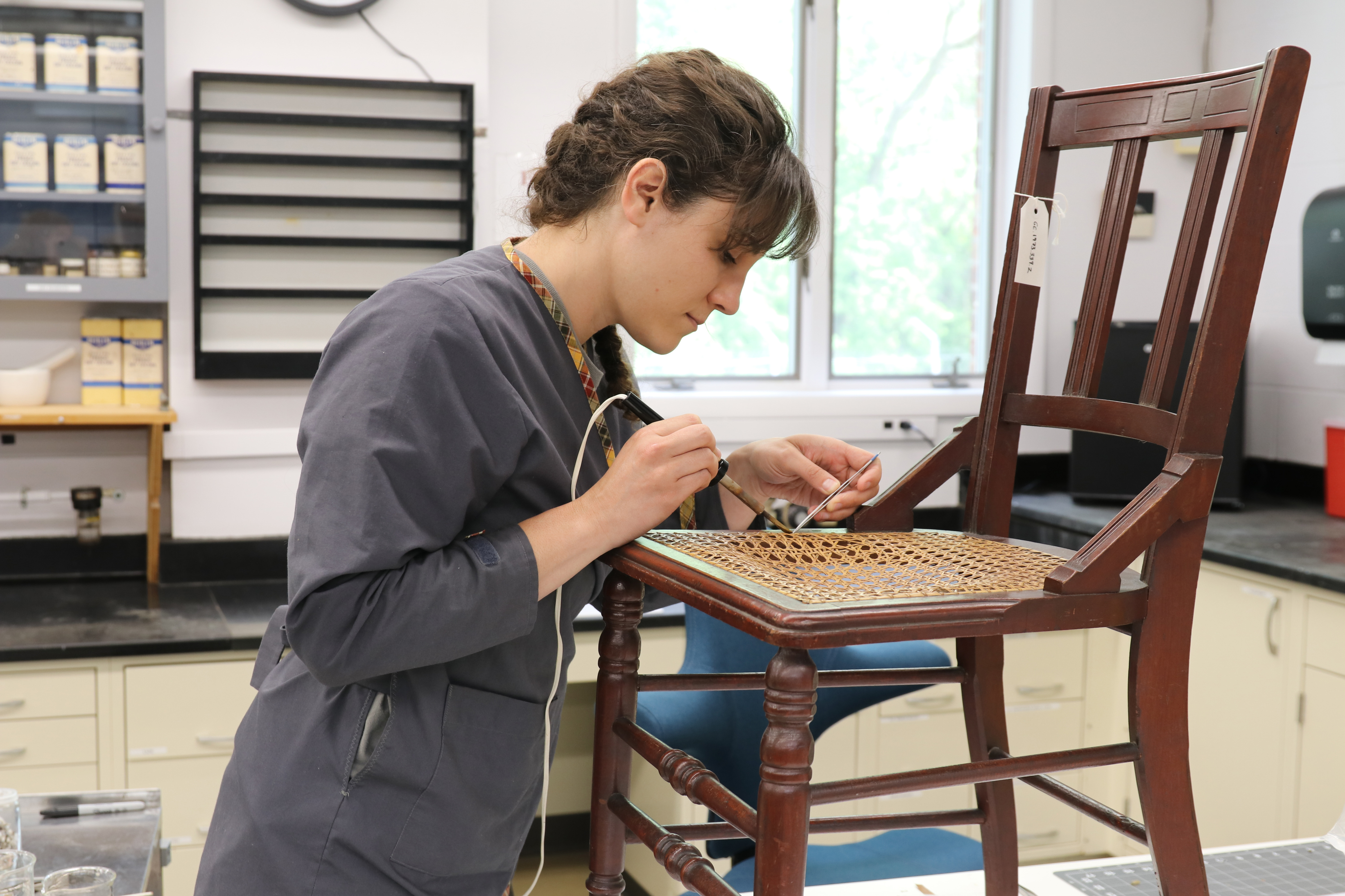 Paige Schmidt: “One of my favorite projects was the treatment of a Gebrüder Thonet rocking chair. The work involved recreating a missing back splat, repairing a partially stripped original coating, and structural stabilization. In addition to the treatment, I also analyzed the wood and coating to learn more about Thonet’s manufacturing techniques at the time. This was a particularly challenging and satisfying project because I was able to restore the chair’s original form and function while also preserving the original material present. Now when I visit New York State historic sites, I am always particularly excited to see the bentwood furniture in our collections, including great examples of Gebrüder Thonets at sites like Olana. Furniture in private collections is often highly altered over time to reflect changing fads or to keep the piece functional, so seeing relatively untouched and well-preserved examples is of great scholarly value- and just so cool!”
