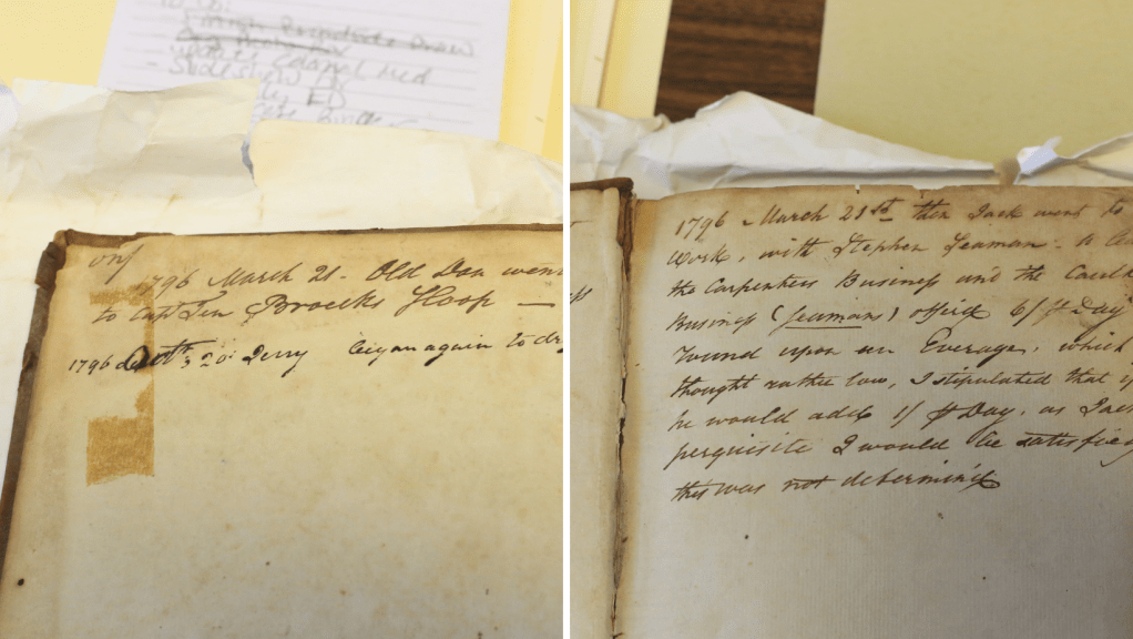 Abraham Van Gaasbeek, the original owner of the Senate House State Historic Site, was a well-known wealthy merchant in Kingston, NY in the 1700s. An enslaver since at least 1755, the 1790 census shows 12 enslaved people living under his roof. As a merchant-trader, access to the Hudson River and reliable sloops were vital to his business. In 1796, two of his enslaved men, Old Dan and Jack, are highlighted in the account book of his son and business partner, Peter. Old Dan was sent to “Captain Ten Broeck’s sloop” while Jack was sent to learn carpentry and caulking. Jack and Old Dan’s work in the maritime trades followed a pattern of enslaved men working for New York merchants on the Hudson River and on ocean-going vessels. Both men appear in the Van Gaasbeek’s family records at different points, including the 1798 distribution of Abraham’s estate following his death. Old Dan was to be granted his freedom but had passed away, while Jack was to be sold.