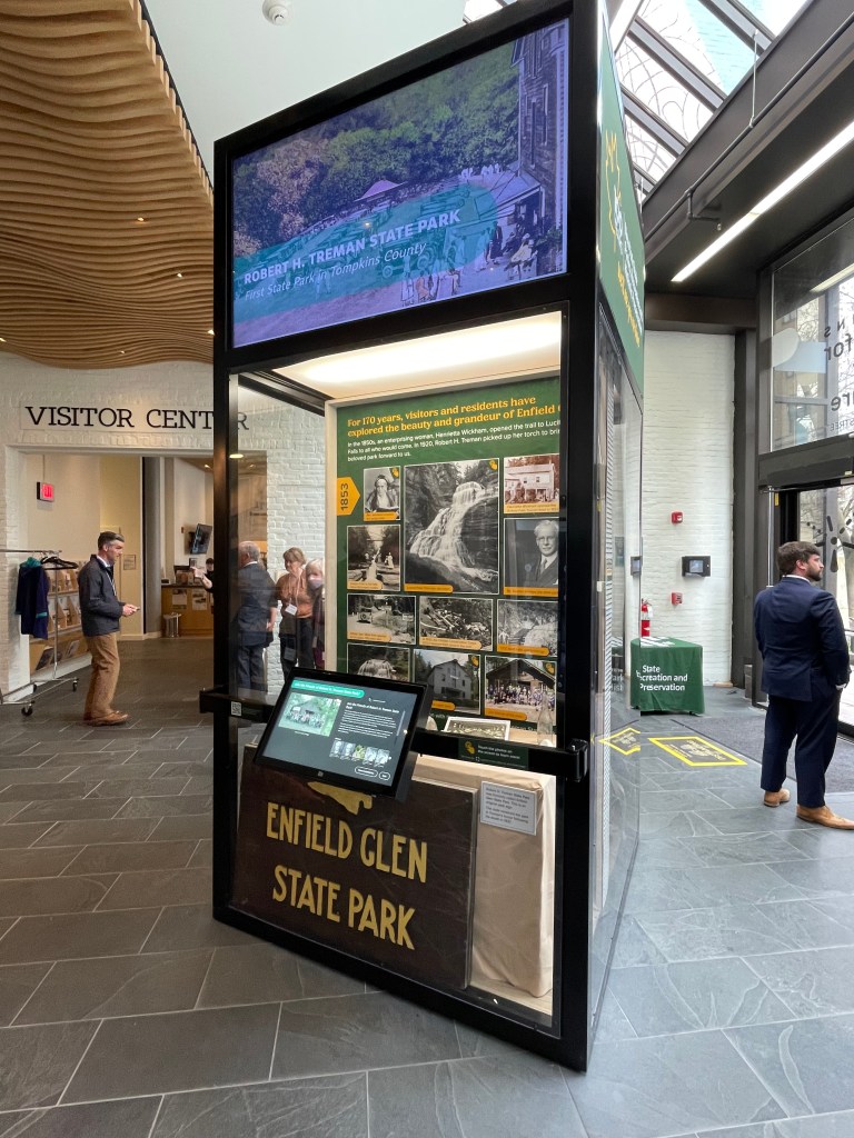 Unable to contain our excitement, we started the celebration early on the eve of our Centennial. After visiting parks in the Finger Lakes region, Commissioner Pro Tempore Randy Simons unveiled a new exhibit honoring Robert H. Treman at the Tompkins County History Center in Ithaca. This first of many celebrations, Simons was joined by conservationists and park advocates from the Ithaca area who perpetuate Treman’s ideals, advocating for a more sustainable world. While mingling at the reception, these partygoers were able to get a first look at the exhibit which highlights our Centennial, the passage for the State Park Act, and the important role that Treman played in the creation of our state park and historic site system.