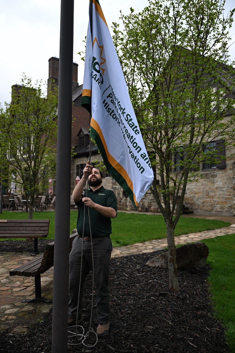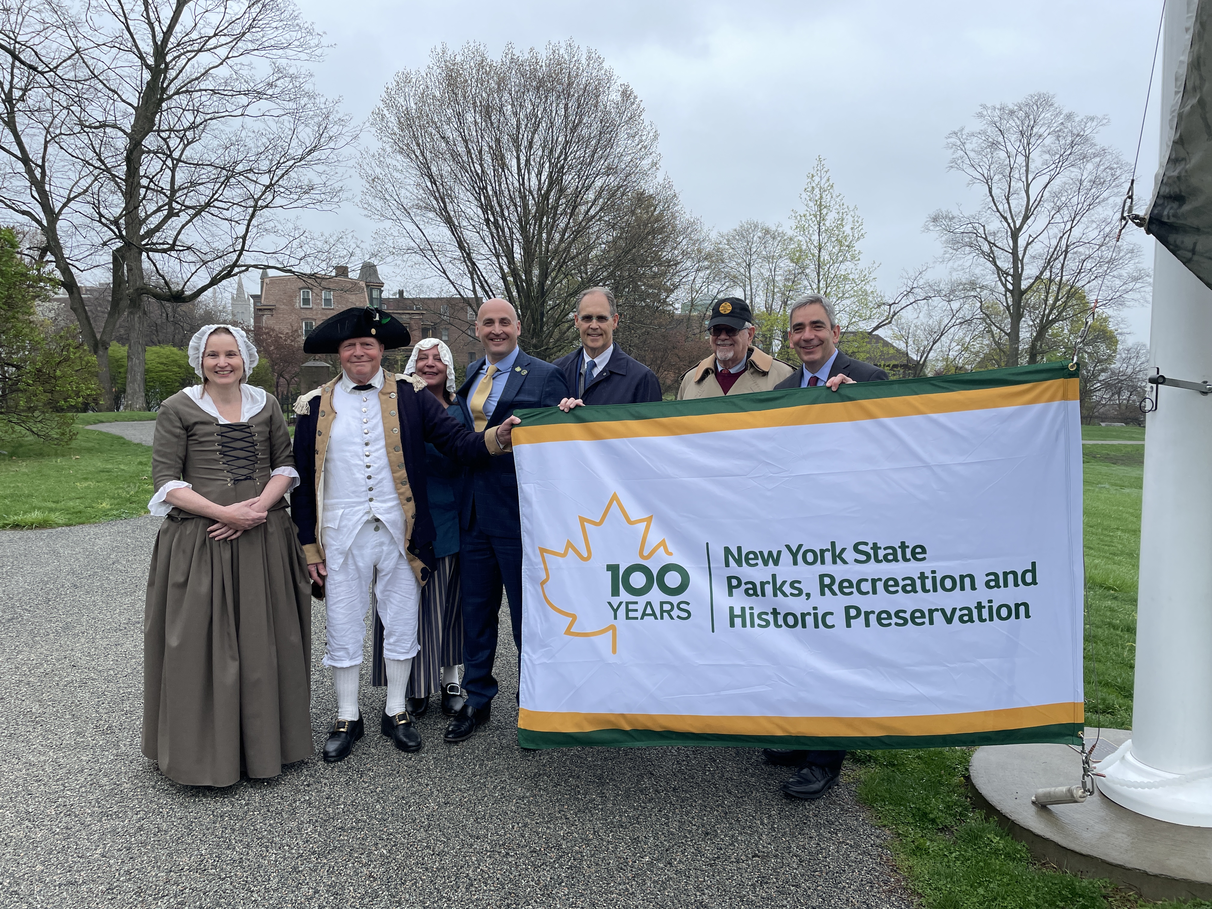 Our first Centennial birthday celebration took place where it all began: the oldest state historic site in the U.S., Washington’s Headquarters State Historic Site in Newburgh. Commissioner Pro Tempore Simons honored the Palisades Interstate Park Commission (PIPC) in the morning as special Centennial flags were raised on flagpoles at parks and historic sites across the state.