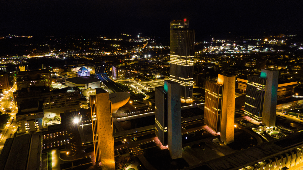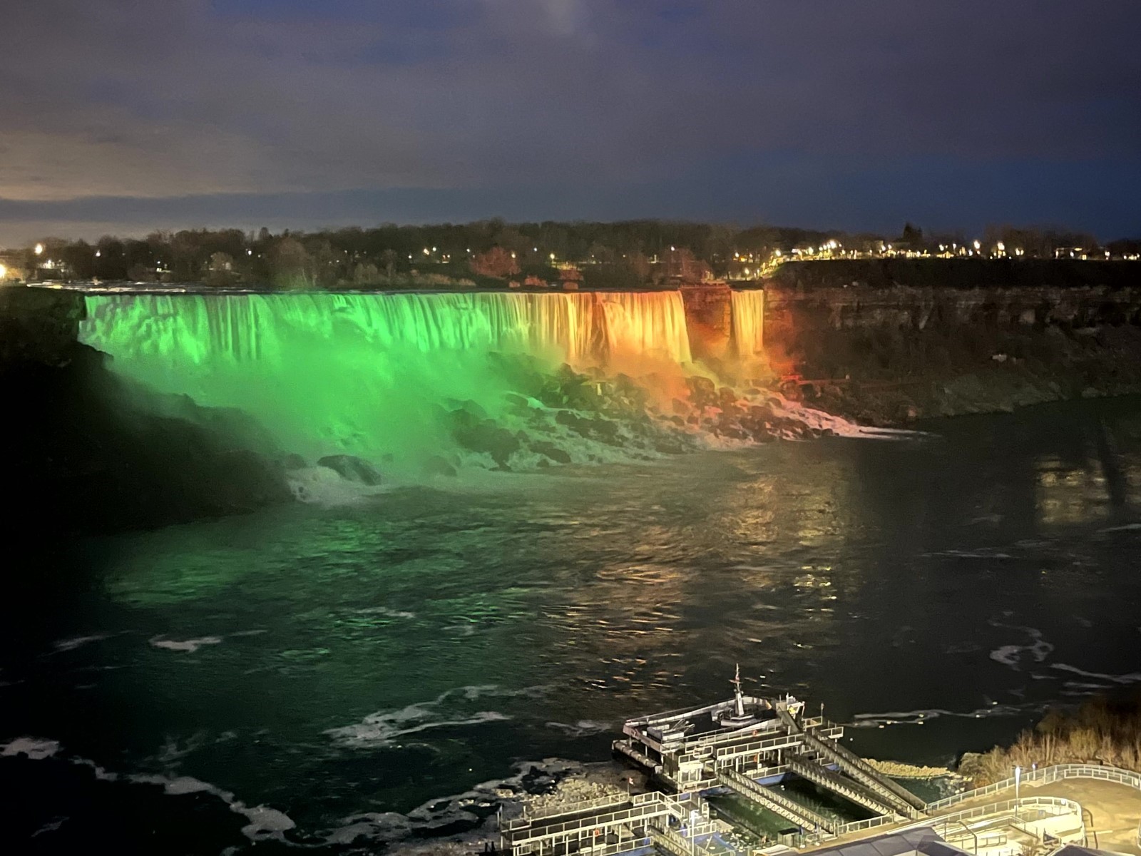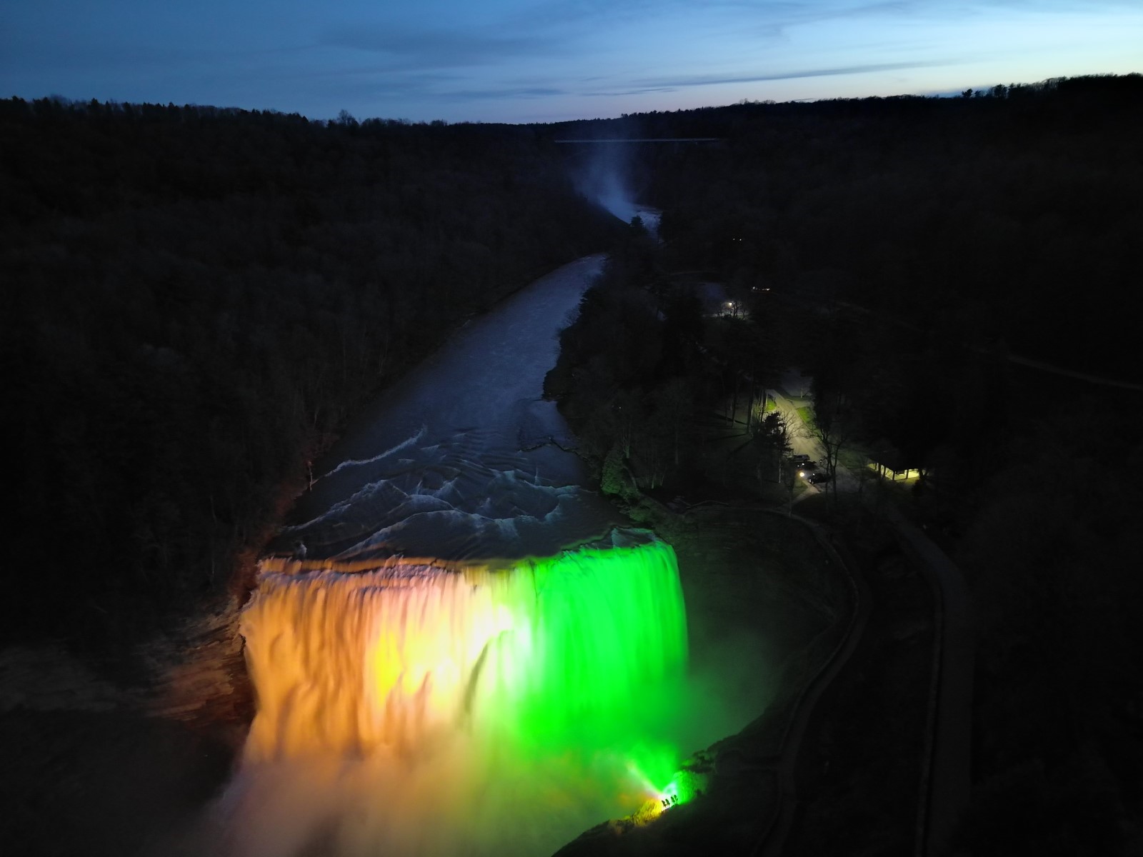 With a countdown and a flip of a switch, Commissioner Pro Tem Simons lit the Lincoln Bathhouse. At the same time in every part of the state, iconic landmarks, state parks, and historic sites joined in, splashing their facades with green and gold lights to be illuminated throughout the night. Niagara Falls, the Jones Beach water tower, and Middle Falls at Letchworth State Park were just a few of the several iconic locations celebrating with us.