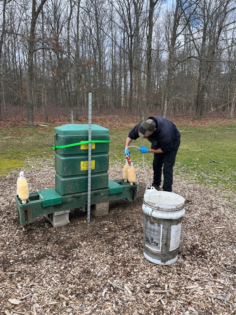 The devices are simple: deer are attracted to a feeding bin that dispenses corn, and while lowering their heads to access the corn, their ears and necks (which are tick hotspots) come into contact with paint rollers that are treated with permethrin. The permethrin kills the ticks on the neck and ears, and during grooming, the deer distribute the permethrin to other areas of their fur. By using this method, we target ticks during a crucial life stage, and avoid the effects of a spray pesticide that might harm beneficial insects.