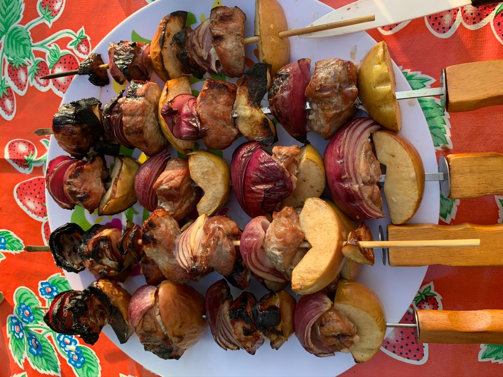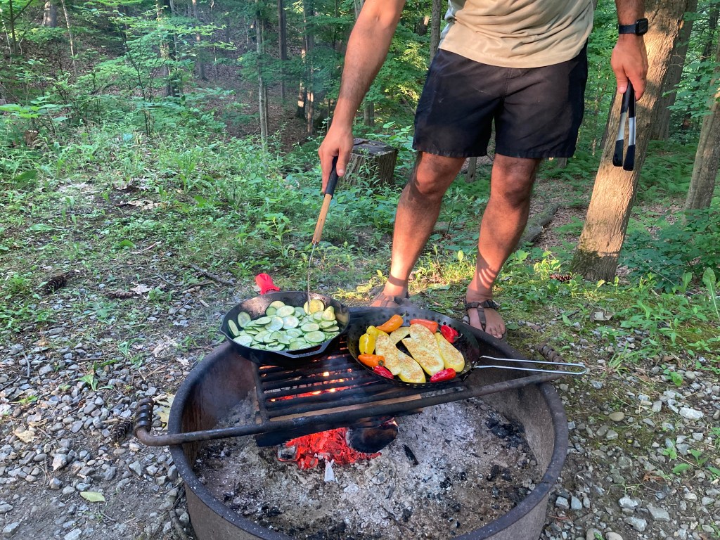 Preparing grilled vegetables over a campsite fire pit; plated roasted fruit skewers ready to serve!