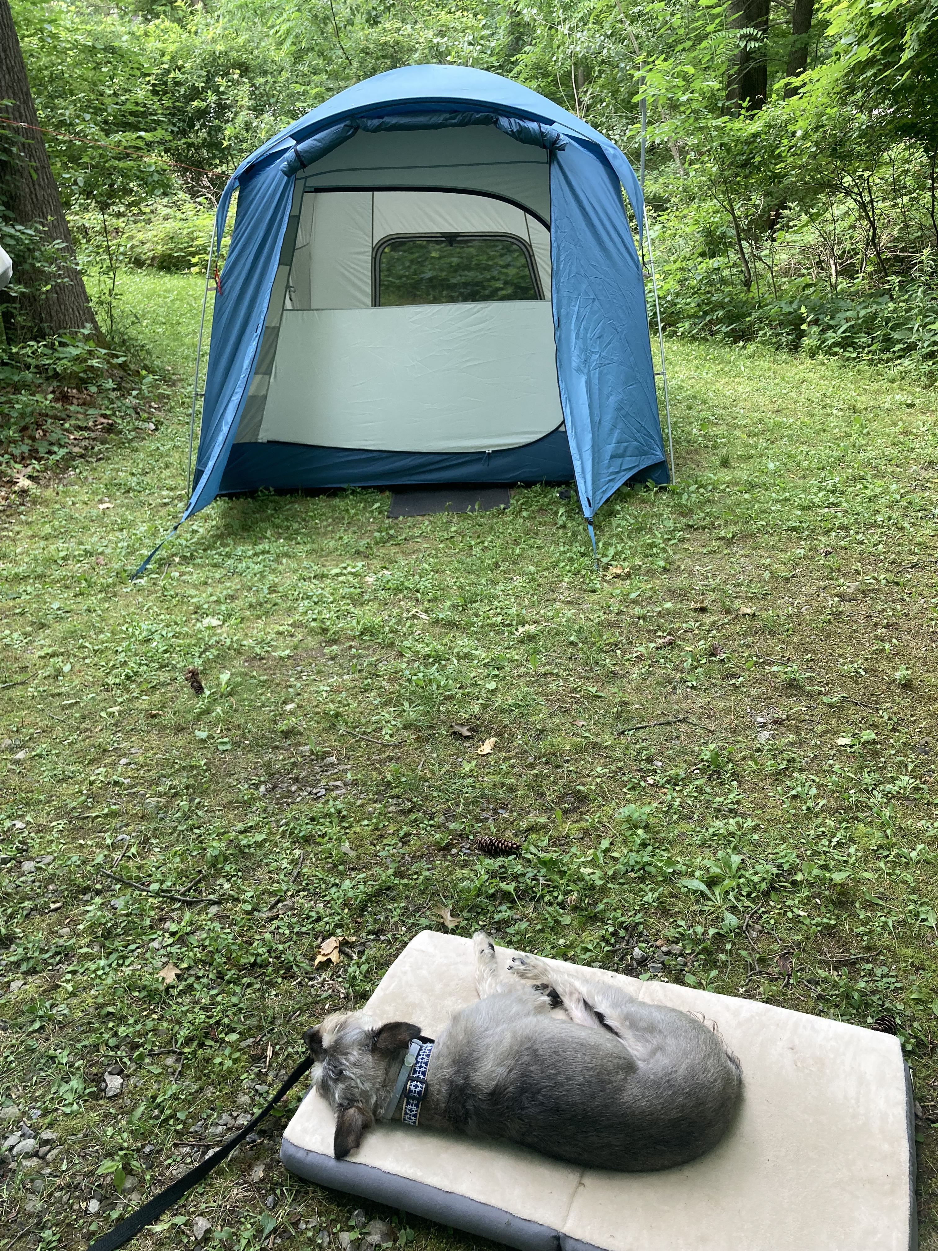 Furry friends, on leashes, resting and feeling at-home at a campsite.
