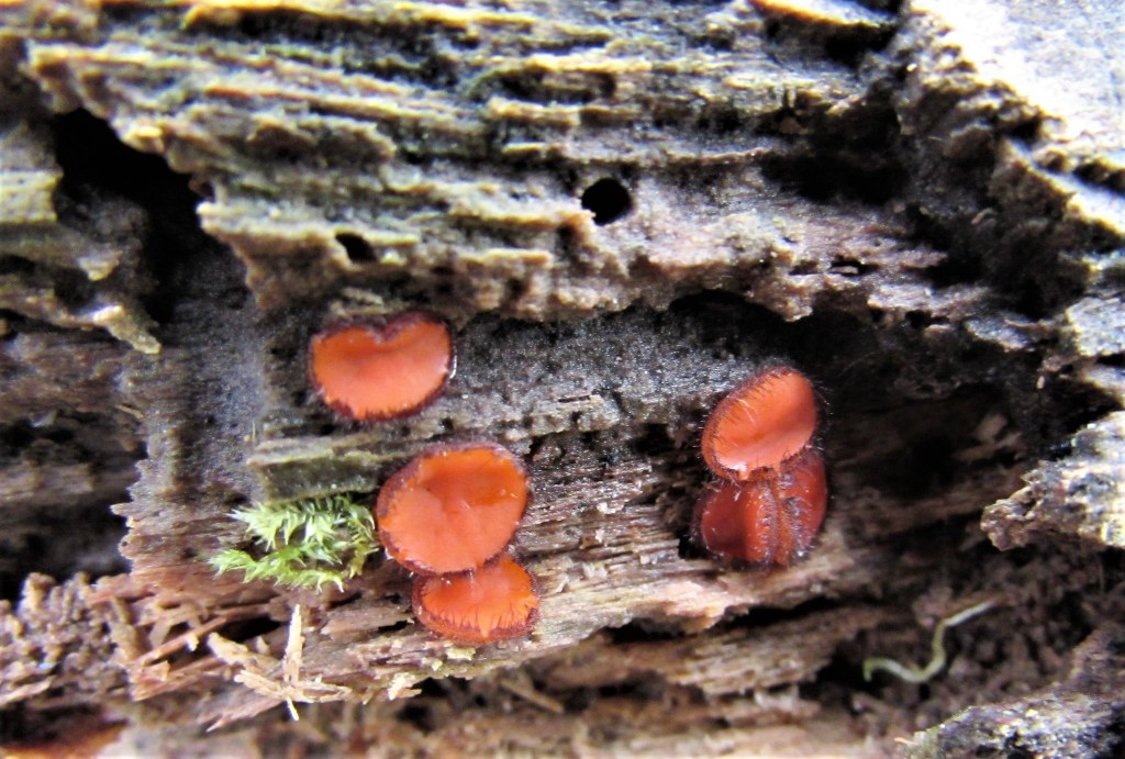 Common Eyelash Cup, Scutellinia scutellata, the final creepy fungi we’ll look for on our journey, is tiny and can be easy to overlook, getting to be no bigger than 1 centimeter per disc and preferring very moist environments. But if you see a fallen log near the riverbank with what looks like a cluster of tiny eyes looking back at you, you may have found the Eyelash Cup Fungus. It is recognizable by its red cup or disc shaped fruiting bodies lined around the edges with short dark hairs that give it this ‘spooktacular’ eyelash look.