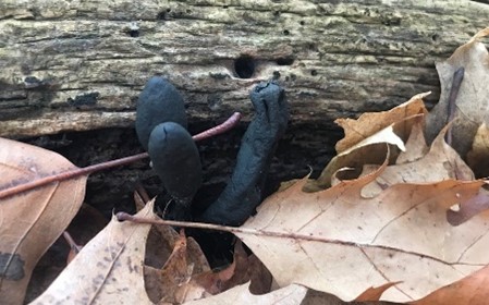Dead Man’s Fingers, Xylaria polymorpha, invades wood that is dead or dying. These club-like structures or “fingers,” called stroma, which normally appear in clusters of three to six, are often found at the base of unhealthy or dead trees and stumps, but can also sometimes grow in mulch. When they first emerge in early summer, they appear light blue-gray with a white tip, but by fall will darken to look like the knobby arthritic digits of its namesake. Not only is this fungus toxic for humans, but mulch made from infected wood is known to cause black root rot in apple trees. So this one is best admired but left alone.