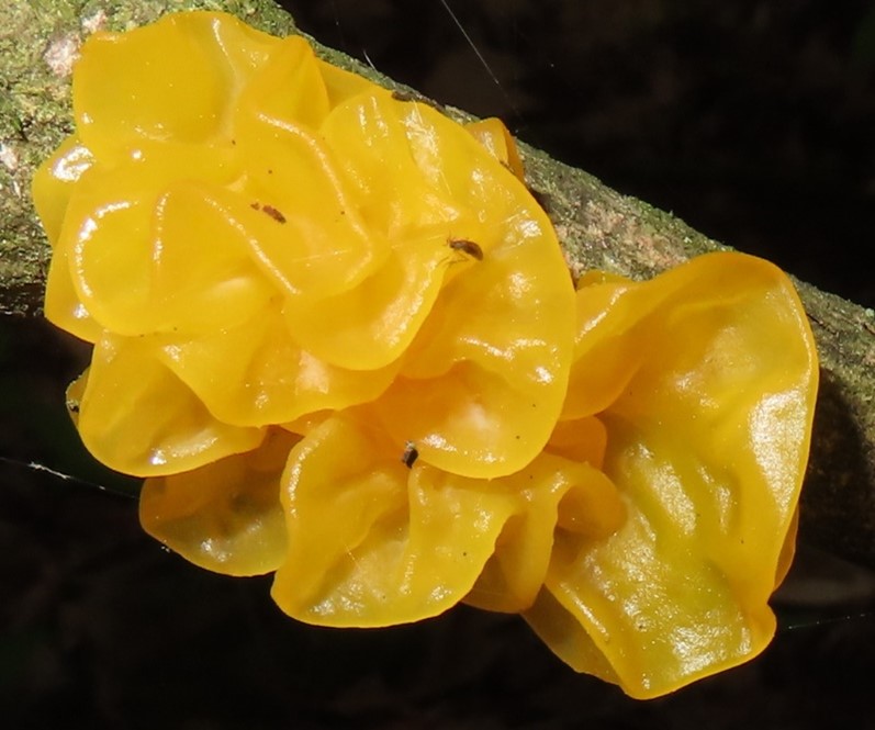 Witches’ Butter, Tremella mesenterica, is also called Yellow Brain Fungus, for obvious reasons. Their fruitbodies are semitranslucent folds and bumps of bright yellow, though over time they can darken to orange or brown. Beyond the spooky names for this jelly fungus, it also has what some may consider strangely creepy attributes. It generally first appears during rainy or very humid weather, growing in the crevices of bark on trees that are affected by wood decay fungus. That is because Witches’ Butter is a cannibal! OK, not really, because individual types of fungi are even more different than individual types of mammals. However, it does consume the living tissue of other fungi, specifically wood-decay fungus. As the weather dries, the large, pliant, jelly fruitbodies shrivel up to small, rubbery, hard to spot bracket – until the next rain, when it ‘comes back to life.’