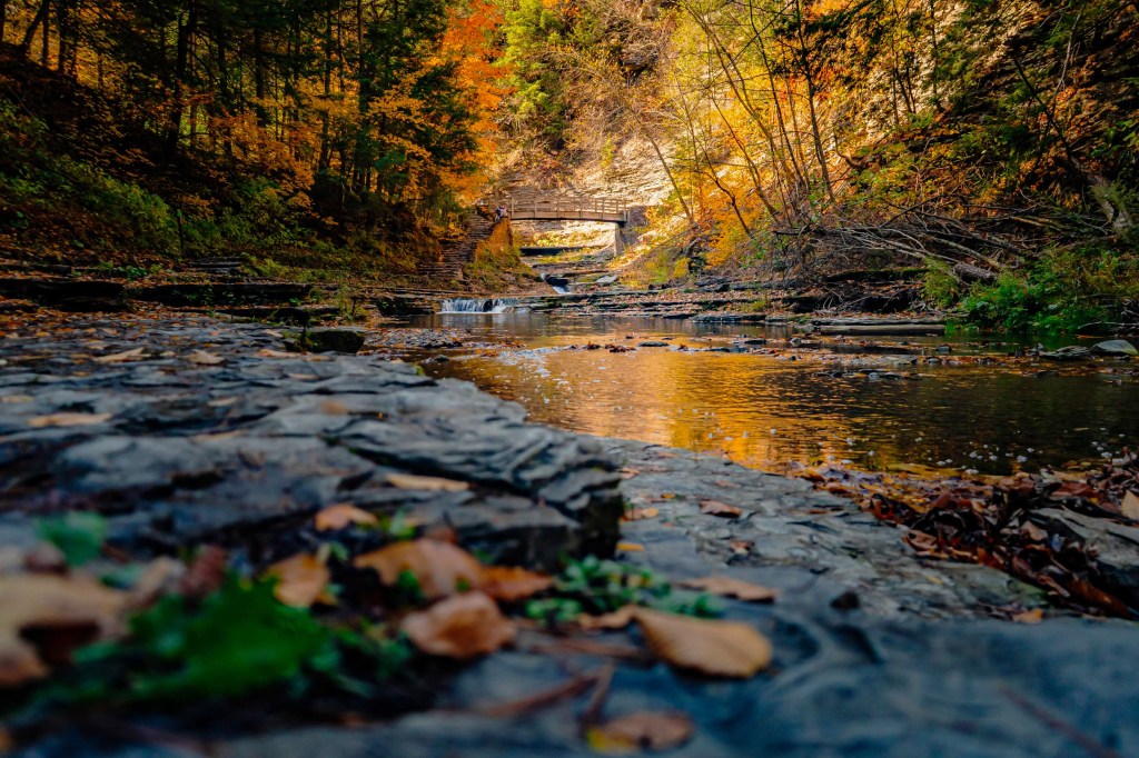 Other state parks popular for their flashy foliage include Chittenango Falls State Park in Cazenovia with its winding wooded paths leading to the falls, Walkway Over the Hudson in Poughkeepsie offering sky-high views of the Hudson River, and Stony Brook State Park in Dansville with trails that take you through and around a rugged gorge.