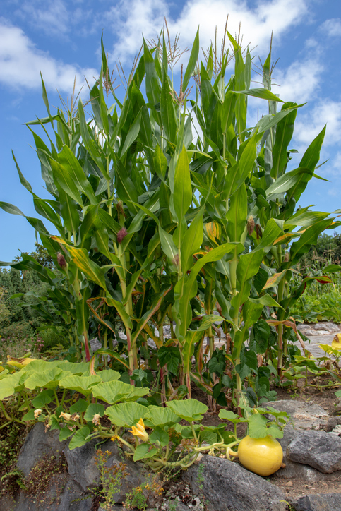 Their traditional diet is mostly vegetarian, supplemented with meat and fats from game like beaver, deer, bear, and fish. The diet’s foundations are corn, beans, and squash — a colorful palette considering the many varieties of corn, including popcorn, and the huge diversity in squash, like pumpkin, zucchini, and cucumber. When grown together in knee-high mounds, these plants structurally and biologically complement each other. Corn forms a solid stalk, which beans climb. Squash leaves shade the ground and help retain moisture. Rotting bean roots replenish nitrogen, which corn needs. Traditional mounds can grow melons, potatoes, and other nutritious vegetables.