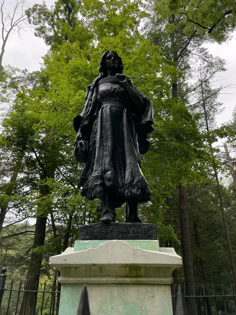 Two years later, with souvenir collectors chipping at Degewanus’ headstone near Buffalo, and the industrializing city threatening to swallow the cemetery, Letchworth paid for the family’s project to move her remains to the Council Grounds, marked with a marble pedestal. The last public appearance Letchworth made before his death was the dedication of a larger-than-life bronze statue of Degewanus on the pedestal. This iconic monument is still visited by Degewanus’ descendants, who sometimes leave flowers.