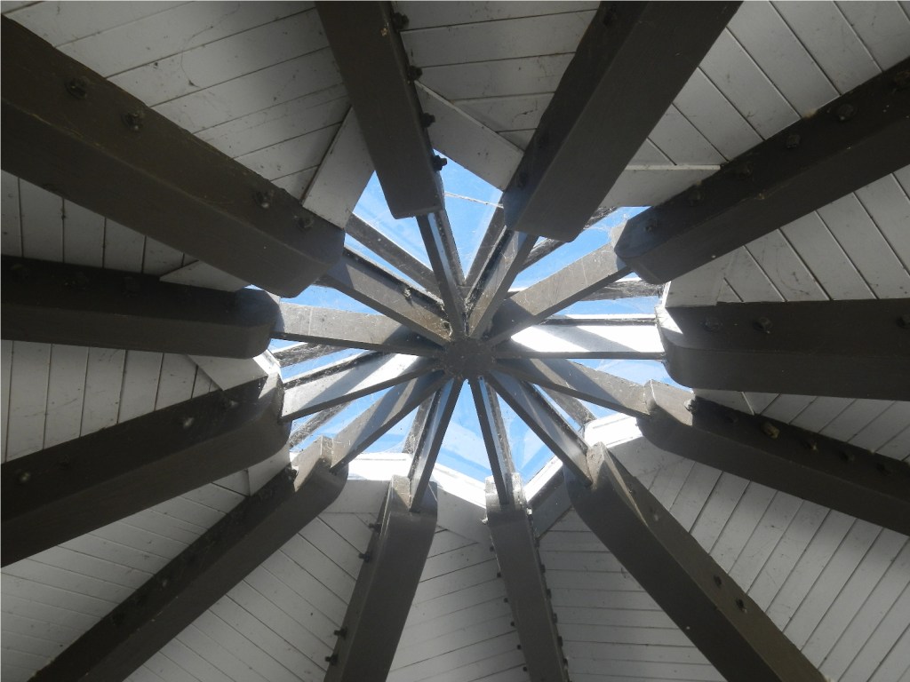 The highly expressive dining pavilion is covered by an undulant, polygonal-form roof that takes the form of a symmetrical flower petal or six-pointed star. The roof is supported by twelve wood rafters that radiate outwards from the center. The principal rafters taper outward. Its bases bear on sandstone piers.