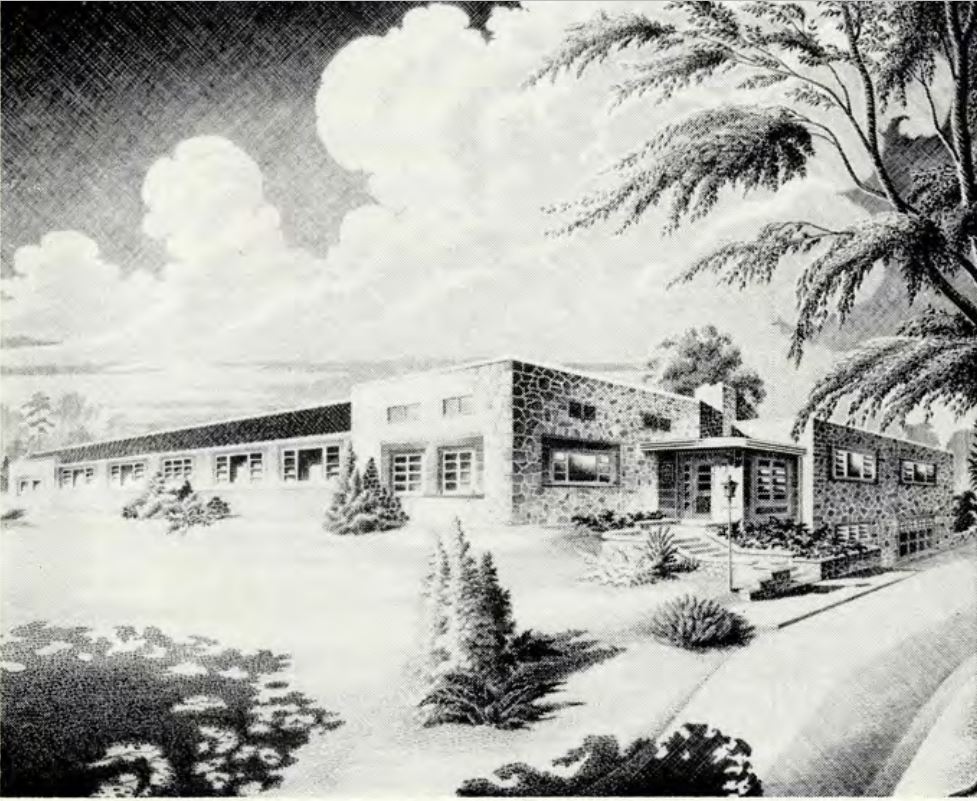 Designed by Parks staff, a view of the building was published in the Conservation Department’s 1950 annual report. The building’s strongly geometric form is evident, consisting of interlocking cubic and rectangular masses, the main sections being flat roofed. While the exterior is stone, ornamentation is absent, and windows are treated more as long ribbons than individual units.