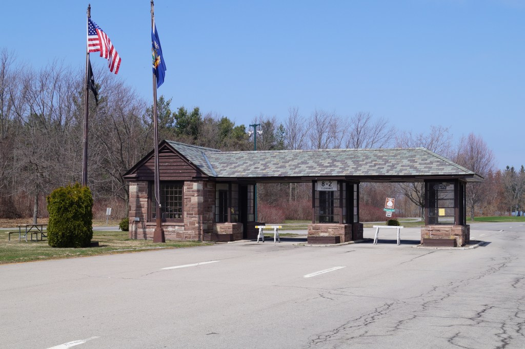 At Hamlin Beach, regionally quarried Medina sandstone was used extensively for the park’s rustic architecture. That tradition continued into the postwar period, as seen in the 1951 contact station. Despite its natural material palette of rough-hewn sandstone walls and slate-shingle roofing, it exhibits a streamlined profile and glass-enclosed contact booths indicative of contemporary trends.