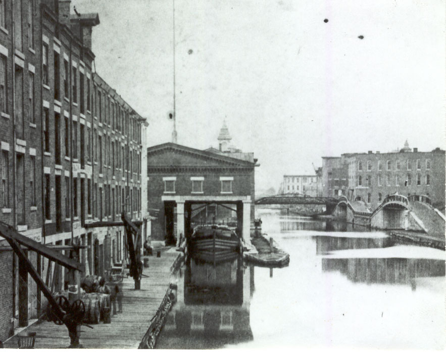 Beginning in the middle section of the state, New York’s young engineering corps, led by Benjamin Wright and James Geddes, was strategic in building the least challenging section of the canal first, connecting Utica on the Mohawk River to Montezuma on the Seneca River, over 90 miles of canal, in a mere three years. Work then moved onto the more technically complex Eastern and Western Divisions, which saw an increasingly immigrant workforce construct engineering marvels, including enormous aqueducts and the famous Lockport Flight of Five locks. Work was completed in October 1825 and a grand celebration took place across the state as DeWitt Clinton travelled aboard the Seneca Chief from Buffalo to New York Harbor, where he ceremonially poured a barrel of Lake Erie water into the Atlantic, symbolizing a “Wedding of the Waters.”