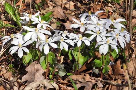 Bloodroot, Sanguinaria canadensis, is a cheery white flower and is named for the red-orange juice in its stem and roots. The flower is encircled by a single leaf. As the morning sun hits the flower, the flower will rise above the leaf and bloom. At night, the flower closes and is again enveloped by the leaf. Bloodroot prefers the shade and moist to wet soil. Like trillium, and a few other early wildflowers, the seeds of bloodroot are sought after by ants, who bring the seed to their nest, eat the fleshy part outside of the seed, then “dispose” of the seed. This allows the seed to propagate away from the original plant. This process of pollination by ants is called myrmecochory.
