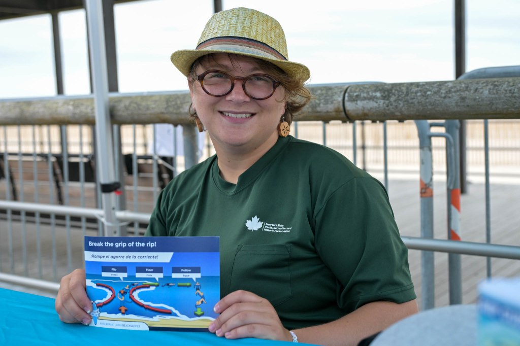 So how do we keep beachgoers safe? Education is key. Knowing how to recognize rip currents and what to do if caught in one could make all the difference for swimmers. In July 2024, the Long Island Region of New York State Parks launched its Water Safety Education Program in conjunction with the Shark Shack at Robert Moses Field 5 for seven dates in the summer. This single-park pilot program was run by the Long Island Regional Environmental Education team and supplemented with volunteer lifeguards visiting the table.