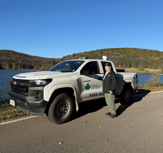 Park Rangers’ duties include patrolling parks, answering questions, and educating the public on park rules and regulations daily. Serious incidents aren’t common, but in the case of three missing children reported at Saratoga Spa State Park, my coworker and I were the first on the scene earlier this year. We obtained descriptions and information, relayed it to Park Police, comforted family members, and began the search. Our efforts positively impacted the response time and outcome of the event, as all children involved were found and in good health. Watching all the family members embracing one another afterwards was very rewarding. It was then that I saw the effects my work has on the public and the benefits the Park Ranger program has on New York State Parks.