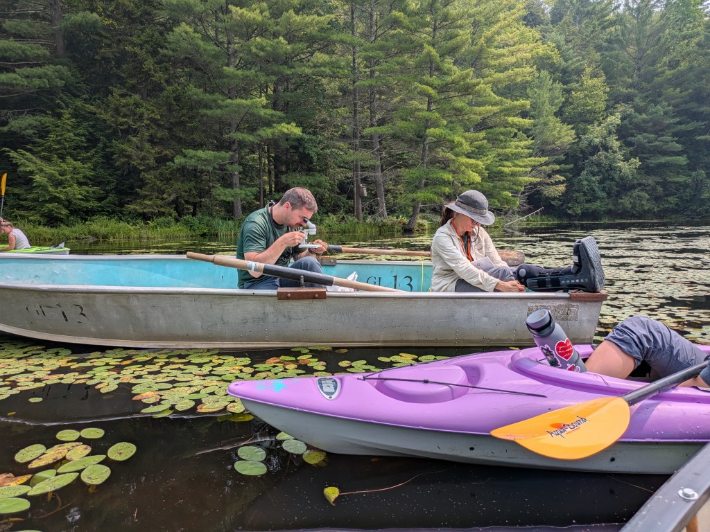 Botany by boat at Moreau Lake State Park in the Saratoga Capital Region! While the ecologists studied the natural underwater community, the park biologist brought his dissecting scope on board to identify the different pondweeds, in hopes of finding one of the rare ones. We got to see native freshwater mussels like this eastern elliptio (Elliptio complanata) on the right.