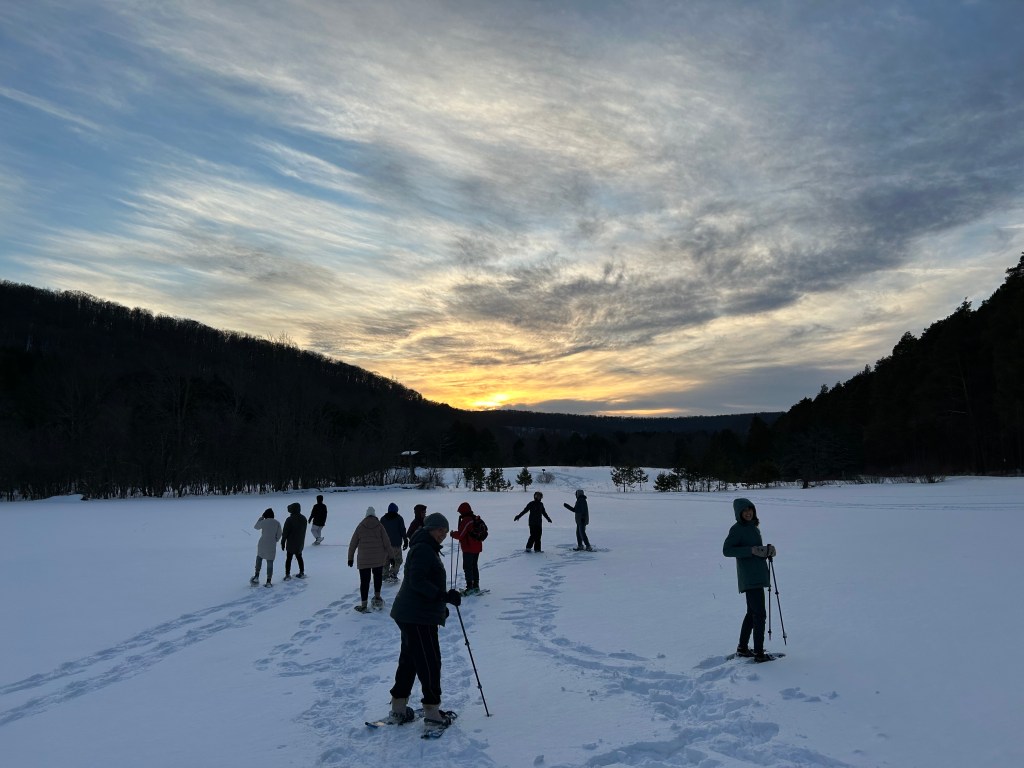 Snowshoeing together at sunset, Allegany State Park in Salamanca.