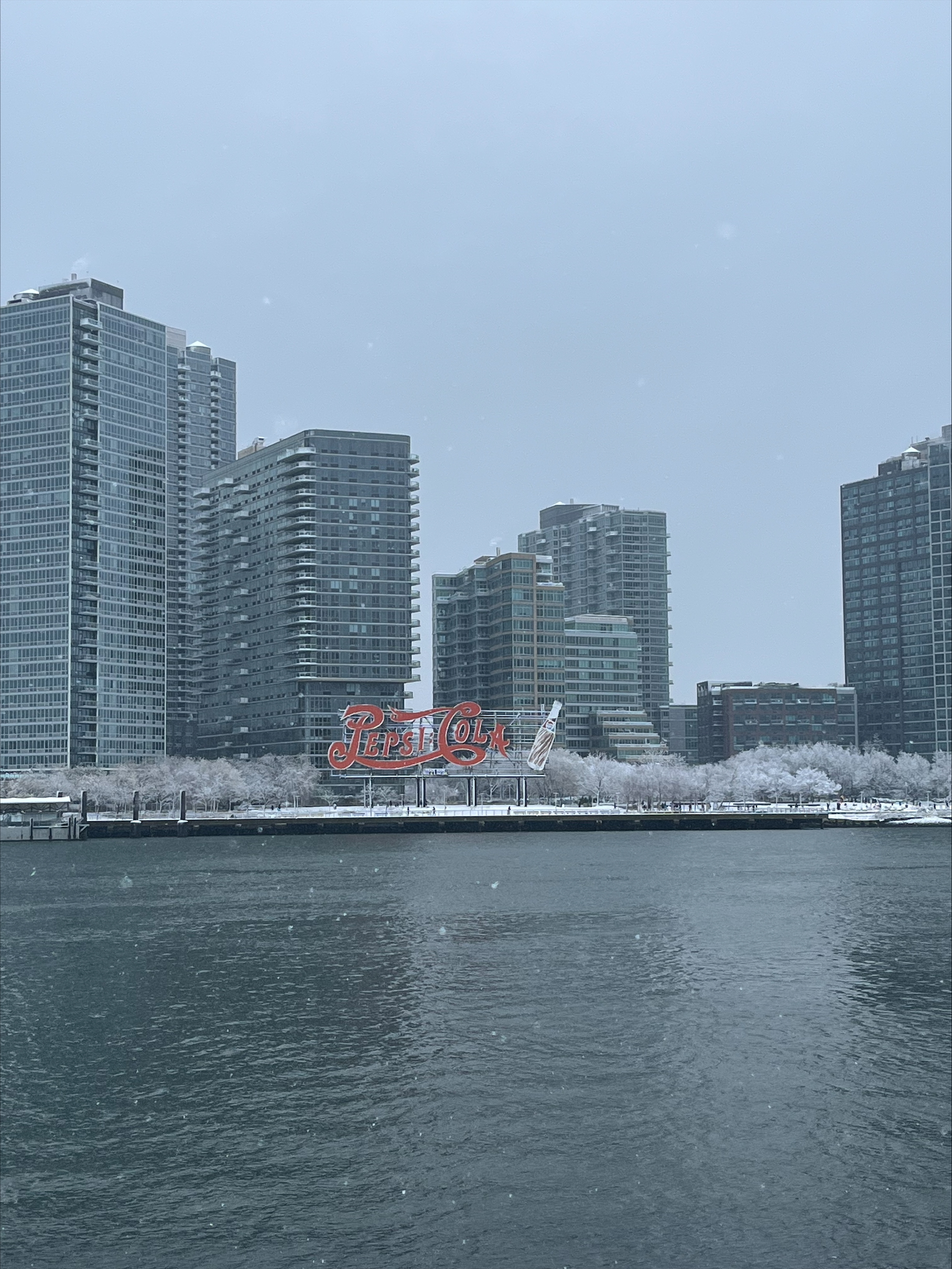 Snowy skyline view of Gantry Plaza State Park from Franklin D. Roosevelt Four Freedoms State Park on Roosevelt Island.