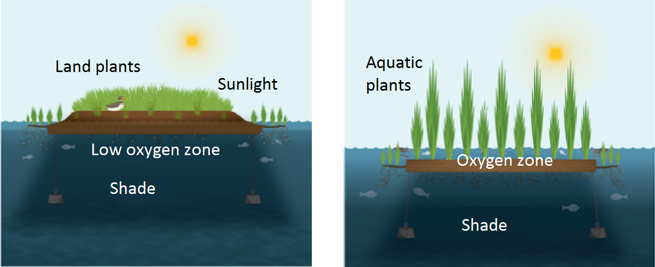 5-(edited) How floating island and wetland work September 19, 2017 1300 × 530 5-(edited) How floating island and wetland work Different designs promote water quality improvement in different ways. Diagram by Floating Wetland Solutions.