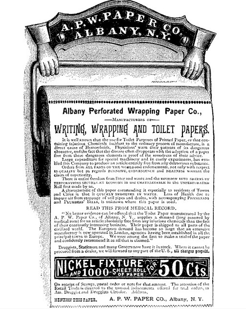 This advertising lithograph for A.P.W. brand toilet paper dates to about 1900. The Albany Perforated Wrapping Paper Company was one of the first to nationally advertise toilet paper. (Photo credit- Albany Institute of History and Art, Digital Image ID 898)