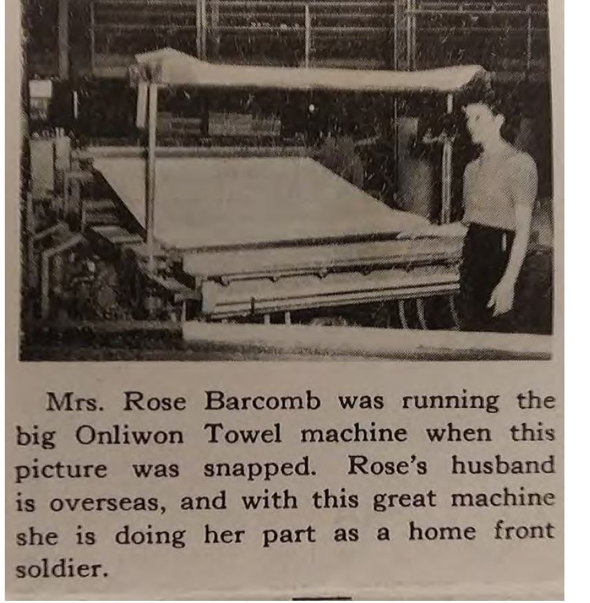 Rose Barcomb stands in front of her machine at the Albany plant in this 1944 edition of the company newsletter. As World War II was raging, the caption calls Rose a “home front soldier” with her husband serving in the military overseas.