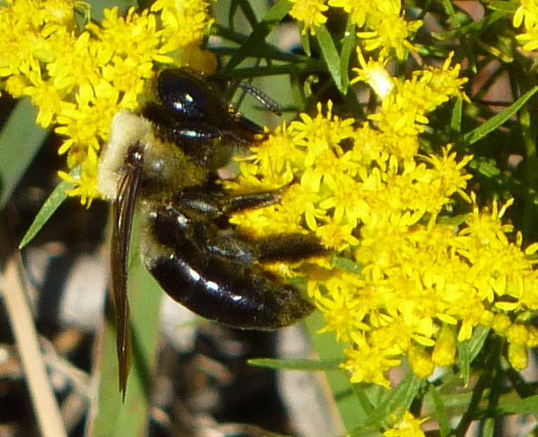 Bumblebees (Bombus spp.) are one of the most effective pollinators. You can see how the pollen sticks to its fuzzy body as this bee feeds on the nectar of this native goldenrod. Photo by J. Lundgren, NYNHP.