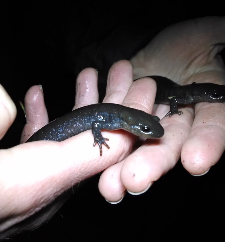 Only some Jefferson salamanders have the silver-blue specks seen on this individual. Jeffersons are also identifiable by their long toes.