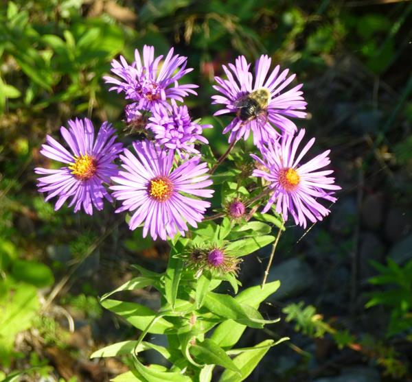 In late summer and fall, the bright colors of asters and goldenrods are especially attractive to bees and many other insects. The native New England Aster (Symphyotrichum novae-angliae) blooms from August to September. This one is being visited by the Common Eastern Bumble Bee (Bombus impatiens). There are many species of bumblebees, but this one is by far the most common in the state, so the one you are most likely to see. Photo by J. Lundgren, NYNHP