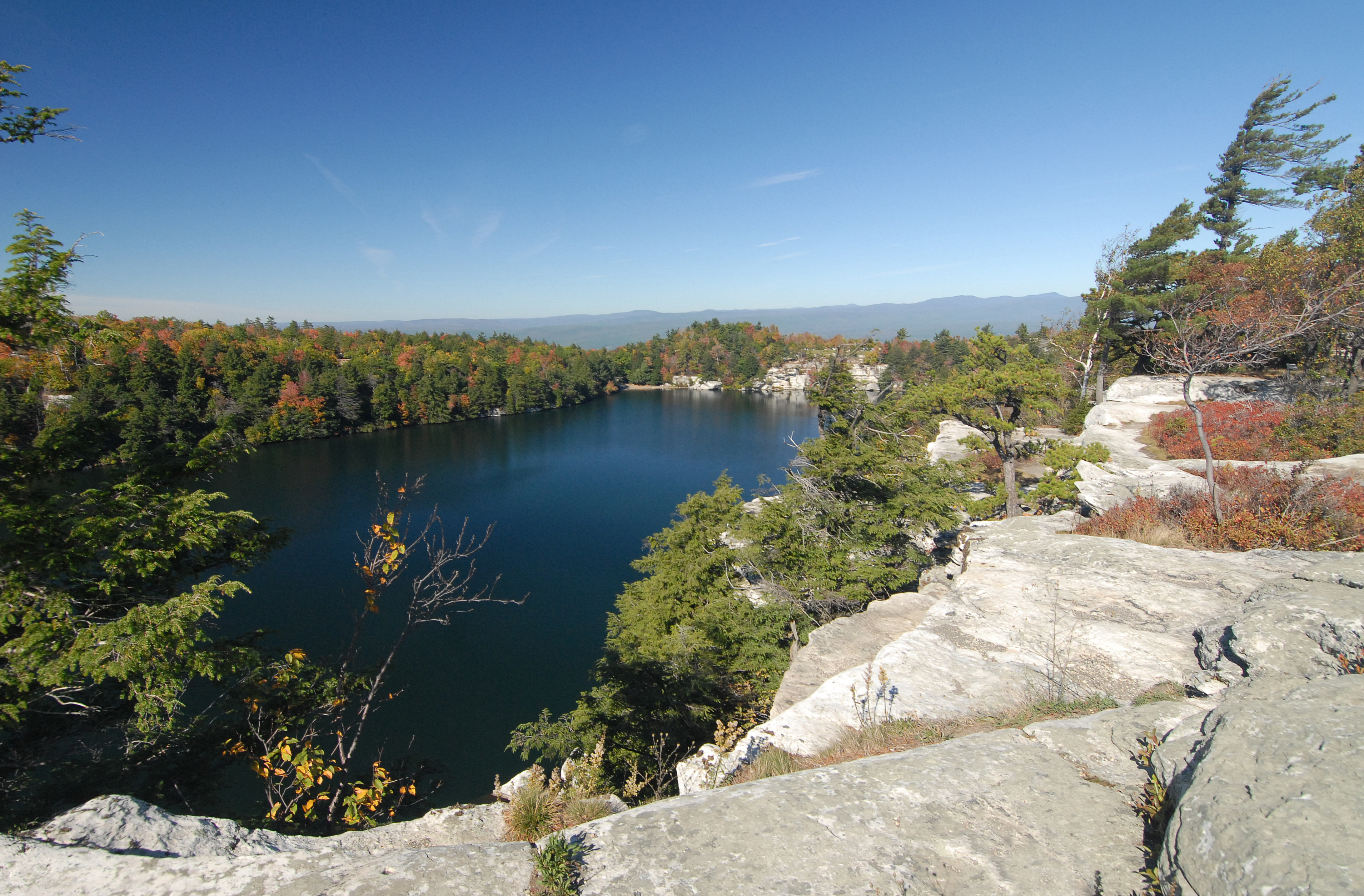 A view of Lake Minnewaska with the Catskills in the background from on top of the quartz conglomerate cliffs surrounding the lake. Photo by John Rozell, OPRHP.
