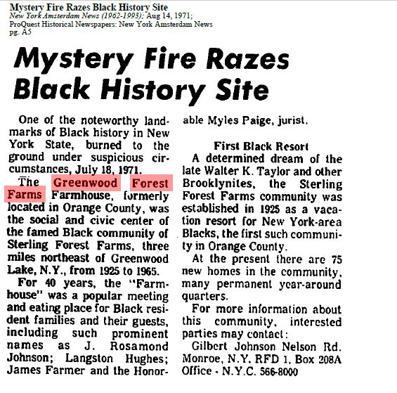 An account of the fire that destroyed the Farm House at Greenwood Forest Farm appeared in the New York Amsterdam News on Aug. 14, 1971. (Photo credit – ProQuest Historical Newspapers)