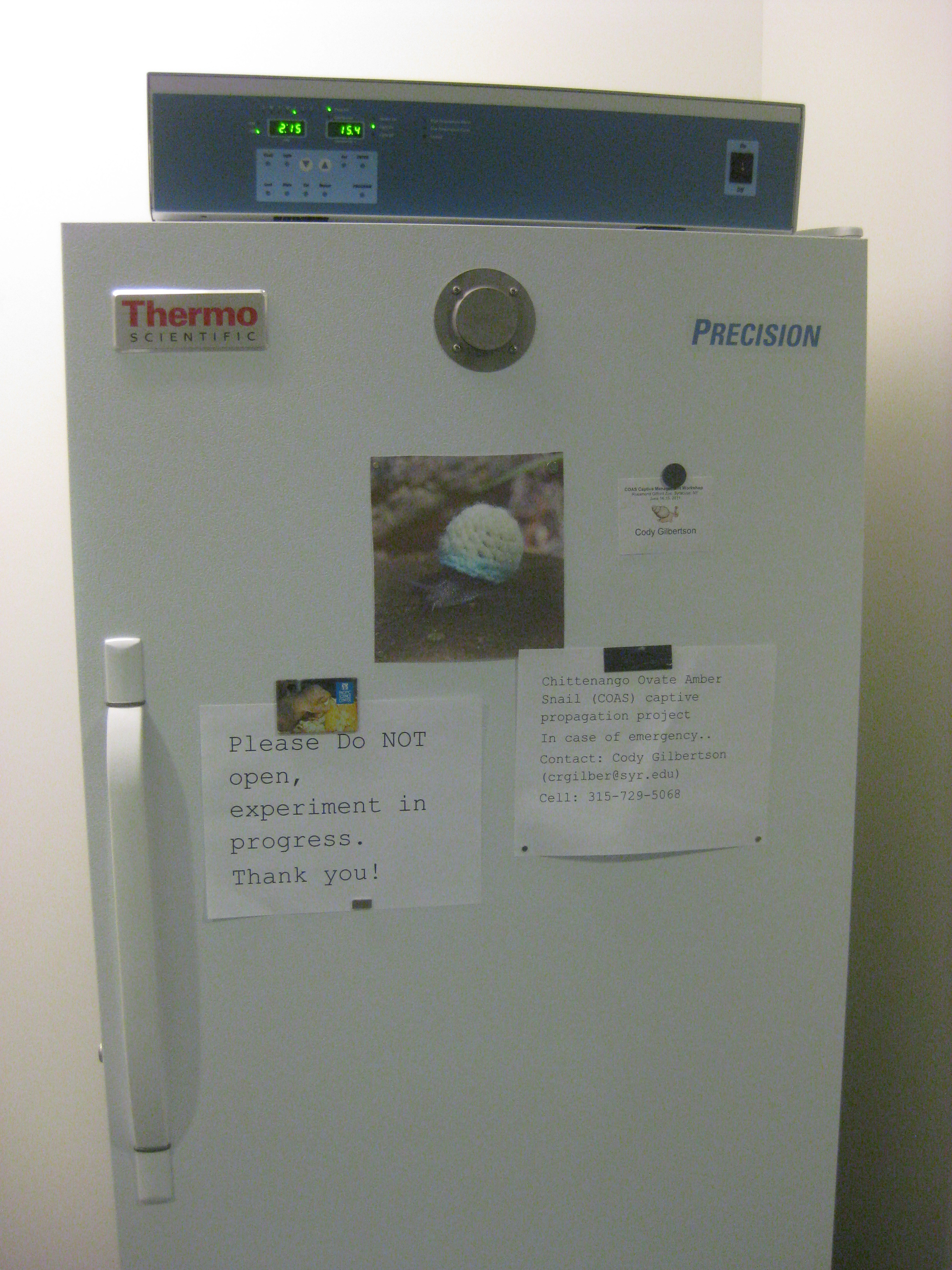 About 500 snails reside in the incubators currently, protected as a “backup” population should some dire circumstances extinguish the Chittenango snails. Hundreds of snails have already lived their entire natural life spans – about two years – in the incubators.