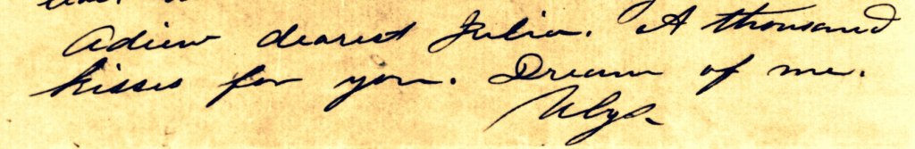 When Grant was in Mexico, he wrote young Julia often with a heartfelt yearning. “You can have but little idea of the influence you have over me Julia, even while so far away… absent or present I am more or less governed by what I think is your will.” Pining for their reunion he wrote, “I am getting very tired of this war and particularly of being separated from one I love so much.” And frequently he ended his letters with sentiments such as “Adieu dearest Julia. A thousand kisses for you. Dream of me” as shown below.