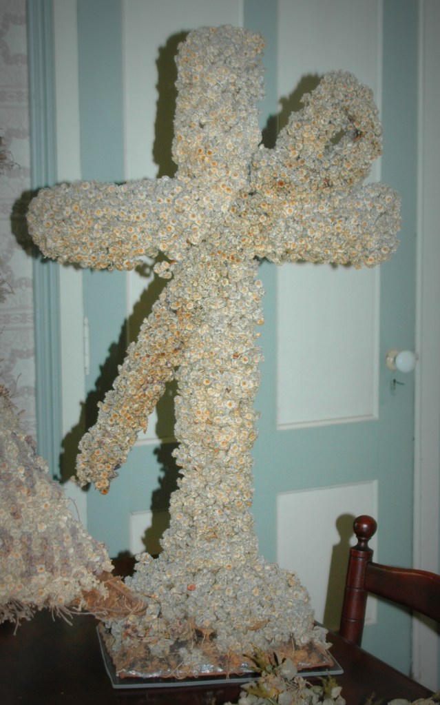 Everlastings were frequently shipped to the United States from Europe and dyed various colors for use by florists. Bunches would be wired to a small stick and inserted into moss which filled a wire framework to create the tributes. It was a painstaking process that involved numerous assistants. Since the displays for Grant were designed only for short-term use, wax coatings on the flowers were deemed unnecessary and not used, according to Treadway’s inspection.