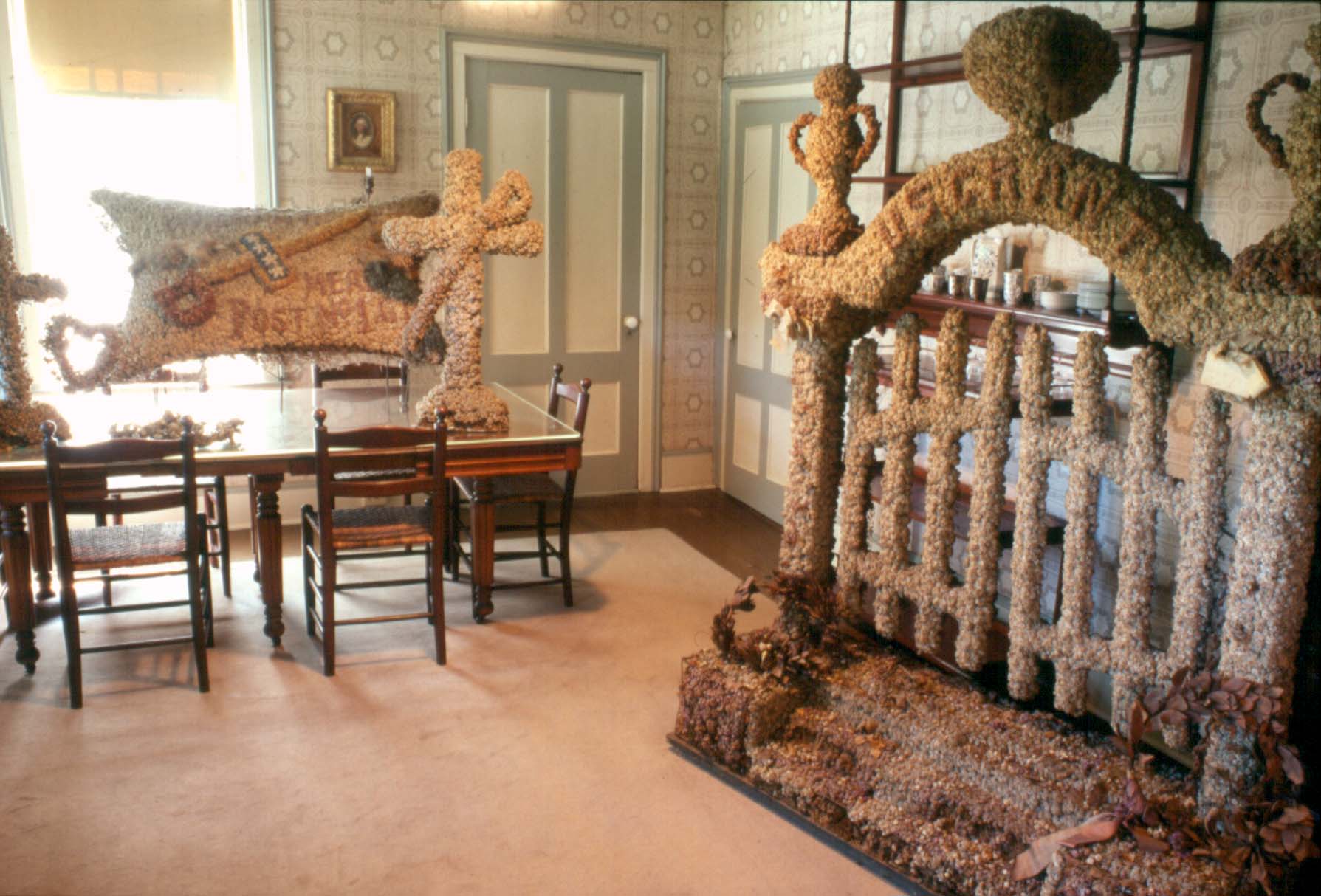 For decades, these displays have remained untouched and undisturbed in the cottage parlor, losing their fragrance and much of their color faded, but otherwise intact, other than being understandably dusty. Last year, these artifacts came to the attention of historical florist expert Robert Treadway (co-author of A Centennial History of the American Florist), who visited in August 2021 to inspect under the supervision of conservators from the New York State Bureau of Historic Sites and site staff.
